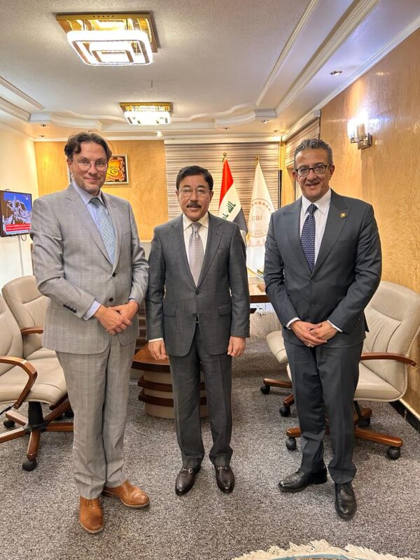 Christophe Michels and Mohanad Al Khattab with the Governor of Central Bank of Iraq.